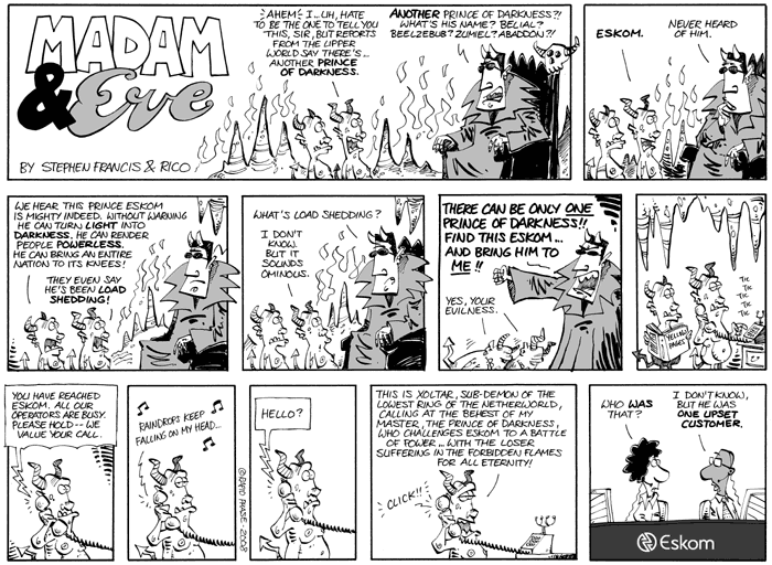 There can only be ONE true prince of Darkness!... but he's got stiff competition in South Africa these days. (I enjoyed drawing this one... something about goofy demons :-)If you'd like to leave a comment, please use the Buzzfuse widget below: